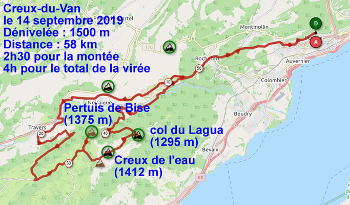 Pour ma part "full vélo" depuis Peseux puis Noiraigue, je longerai l'Areuse jusqu'à Travers à la hauteur de l'usine électrique je prendrai la route dite de la "Banderette" puis rejoindrai le "Couvent" avant d'atteindre le Soliat. La descente se fera par la "Grand Vy", le "pré aux Favre" puis le chemin des "déracinés", la ferme Robert, champ du Moulin, Rochefort et retour à Peseux.