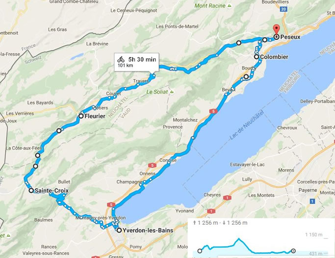 Arrivé au sommet, c'est trop cool, j'ai mis la grande vitesse et jusqu'à Yverdon j'ai quasiment toujours pu la laisser. Arrivé en plaine j'ai cherché le lieu de pic-nic où j'étais le premier convive sur le coup de 11h15 soit 3h30 depuis Peseux (parti à 7h45 ), un temps honorable pour un "vieux cheval".