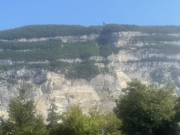 A Annemasse des travaux dans la ville a mis mon GPS en pagaille et après quelques hésitations j'ai retrouvé mon chemin qui m'a conduit sur le flanc du Salève. Après quelques encâblures dans la montée le GPS m'a indiqué un petit chemin sur la gauche de type sentier qui s'enfonçait dans la forêt mais jonché d'un volume de caillou tellement grand que ma roue patinait. J'ai dû faire de la poussette sur une centaine de mètres avant de me remettre à rouler.