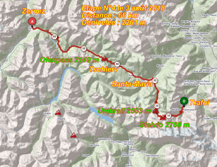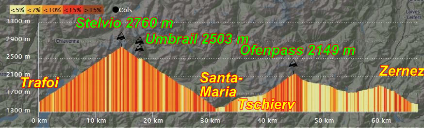 J'ai choisi l'option "hard" avec l'ascension du Stelvio sur les 14 derniers kilomètres (depuis Trafoi car j'avais fait les 12 premiier la veille depuis Prato allo Stelvio) puis celle de l'Ofenpass ce qui constituait une dénivelée de plus de 2200 m. Je titillais ainsi mon seuil maximum qui fleurte avec une dénivelée d'environ 2500 m.