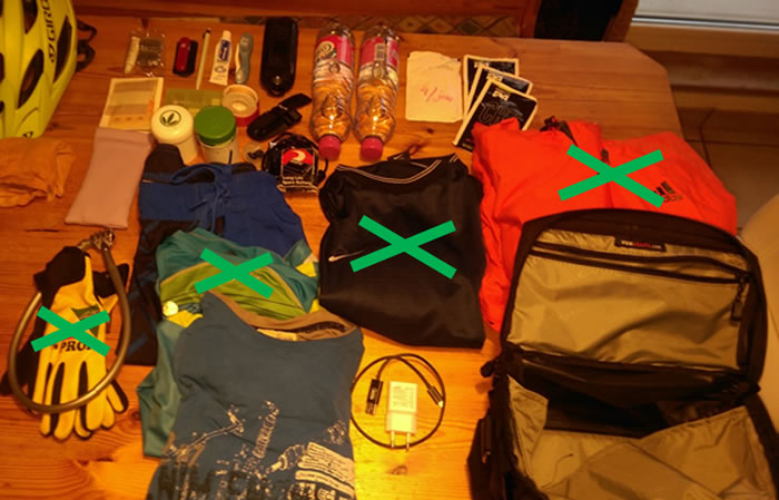 Ci-dessous le paquetage au guidon de 3 kg (les croix signifient que l'équipement n'a pas été utilisé) :