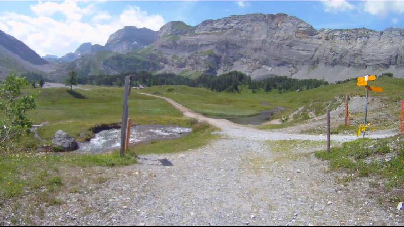 Après être arrivé vers 10h sur place à Kandersteg et avoir trouvé le lieu où j'allais dormir, je pose mes affaires dans le dortoir qui sert de lieu d'entreposage des skis l'hiver et je fais un petit tour devant l'étang qui se trouve à 50 m de l'hôtel des