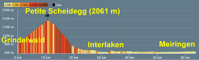 Avant cela il faudra dompter la pente de la "Petite Scheidegg" qui de "Petite" n'a que le nom car en effet elle est plus haute que la Grande Scheidegg mais qui n'est pas considérée comme un col par le répertoire des cols de Wikipédia. En effet on ne peut pas passer aisément en voiture, la pente étant trop forte sur les chemins cailouteux de la fin de la montée.