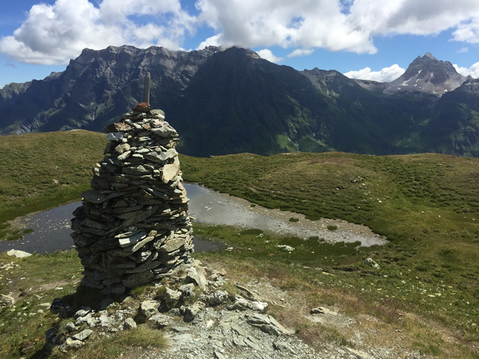 Après avoir pu bénéficier d'un bitume devenant terrain puis se commutant en chemin rocailleux, la montée s'est faite en majeur partie en "poussette" parce que pour moi du moins il était impossible de rester sur le vélo. Sur le site "Suisse mobile" il indique 20 minutes de poussette, pour ma part c'était je pense 3 fois plus sans avoir eu le chronomètre en main. Entre fleurs des champs et pâturages donnant aux vaches le fumet futur de notre fromage, je me suis hissé au sommet de ce col de muletier particulier puisque ce sont des polonais qui le construisirent en 1940-42, c'était certainement mieux que de ce reprendre du plomb sur les champs de bataille que "l'oncle Adolf" avait érigé dans l'Europe entière.