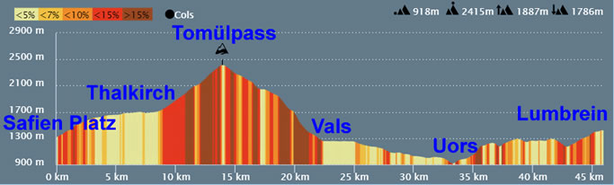 passage du Tomülpass à plus de 2400 m, "la messe n'était pas dite". Certes l'arrivée à Vals me permit de remplir mes gourdes avec une eau saine puisque diffusée à large échelle dans les commerces suisses. Mais en sortant de "Vals", "Strauss" a continué les siennes en me jouant une musique parfois enchanteresse comme la descente de la rivière "Valser Rhein" jusqu'à Uors dans de belles gorges à vitesse raisonnable mais après les "mélodies" sont devenues plus grinçantes avec des montées et descentes dans les champs puis dans la forêt. Le point d'orgue a été relativement rapidement de voir le village de Lumbrein mais de l'autre côté de la vallée. Il fallut donc aller au fond de la vallée et redescendre au niveau de la rivière puis se taper une dernière montée qui s'est fait à l'arrache avec la pointe de l'église "typique grisonne" en forme de "motivation" pour atteindre le 7ème ciel...:) et avoir accès au traditionnel "cordon bleu" digne d'une récompense gustative à la hauteur de l'effort fourni.