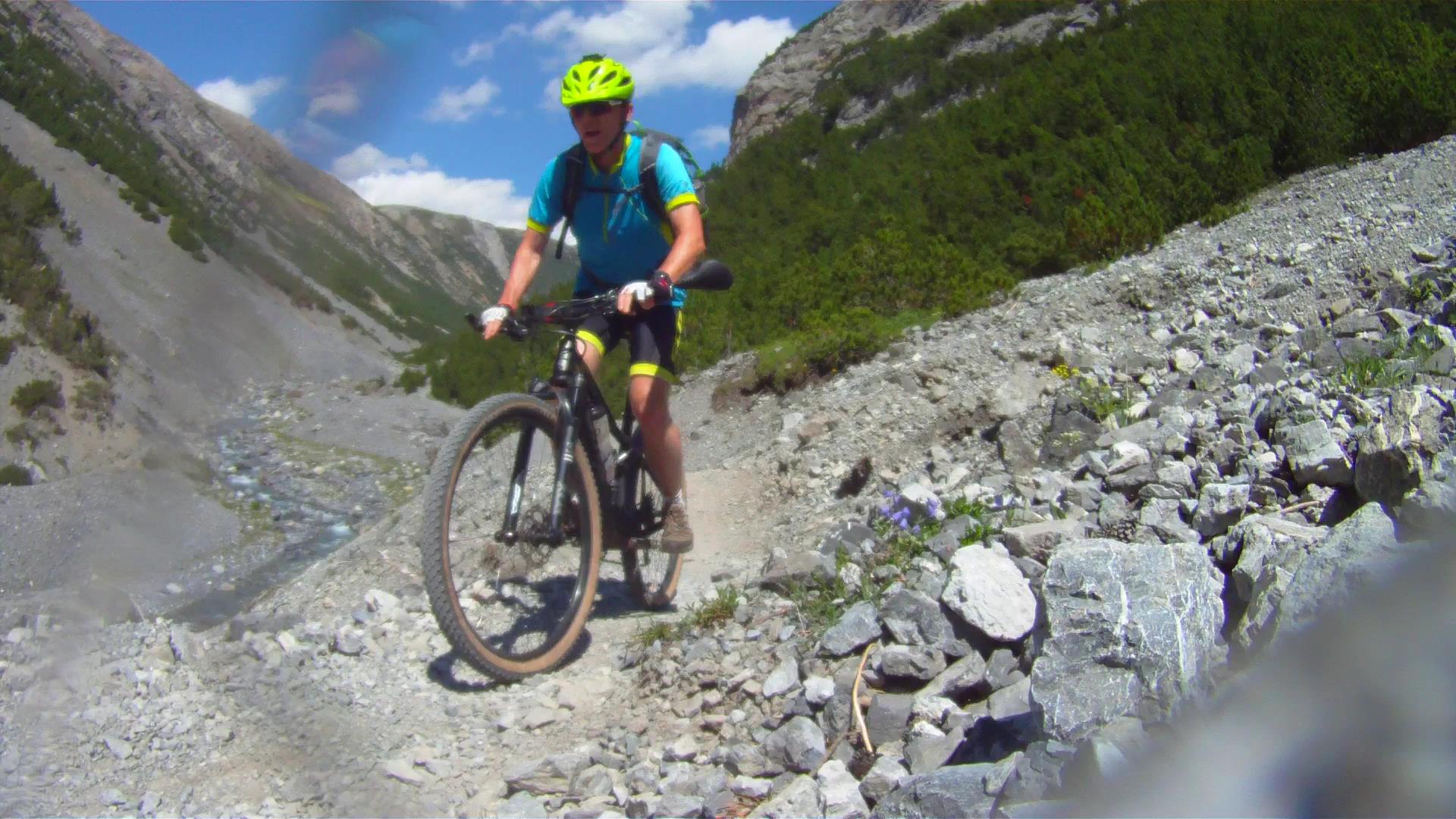 On poursuit ensuite sur une pente douce en direction de l'Italie, en se laissant subjuguer par la beauté du décor. Plus on se rapproche de la frontière et plus le chemin se fait étroit. On rejoint enfin un superbe singletrail fluide conduisant au Passo di Fraele, point de départ de la deuxième ascension du jour, en direction du Passo di Valle Alpisella. Les 350 mètres de dénivelé derrière soi, on descend à toute vitesse jusqu'aux rives du Lago di Livigno.