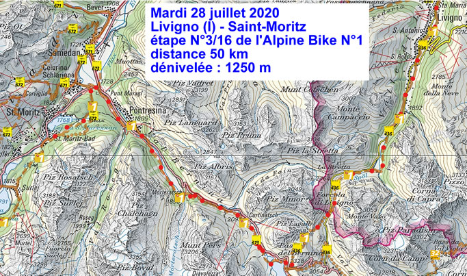 Mardi 28 juillet 2020 Livigno (I) - Saint-Moritz (étape N°3/16 « l'Alpine Bike 1 ») (intro pris du site "SuisseMobile") Flow et trail au lieu de Gucci et Prada: le retour à St.Moritz la mondaine vous réserve trois cols, dont une réelle montée. A partir du Bernina vous attend un itinéraire roulant à travers prairies de montagne et forêts de mélèzes jusqu'au village de luxe, avec les glaciers du Piz Palü et du Piz Bernina. Alors que les nombreux amateurs de vélo de route doivent composer avec le trafic plus dense encore sur la grande route menant à Forcola di Livigno, les vététistes sont privilégiés. Le circuit VTT suit parallèlement la route, à l'écart du trafic, se dirigeant vers la douane au poste-frontière.