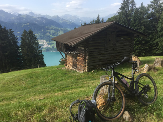 La descente allait se faire en douceur par une route goudronnée que j'avais déjà empruntée dans l'autre sens avec un collègue de travail et je me souvenais que nous avions à l'époque été surpris par la beauté d'une place de pinique. Je l'ai retrouvée, m'y suis arrêté et lorsque 2 jeunes hollandais s'y sont aussi arrêtés, nous avons bavardé dans ce lieu qui est magique au niveau de sa vue panoramique sur le Niesen en les montagnes alentours.