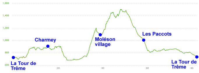Une heure encore de montée environ me sera nécessaire pour achever la dénivelée totale m'offrant ainsi une belle descente sur les Paccots. Là je trouve pour la première fois en environ 5 heures de route, une fontaine à eau potable. Je rempli mes gourdes et réalise la fin de la journée sur les routes cantonales pour rejoindre au plus vite ma destination de départ, à savoir "La Tour-de-Trême".
