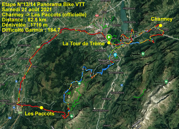 La montée se fait sur la route cantonale et d'entrée une piste est coupée, je vais sur la piste en travaux pour éviter le détournement. Plus tard à la sortie de Broc, une déviation vélo m'oblige à prendre sur la droite. Je rencontre un cycliste et nous faisons un bout ensemble de la montée dans la forêt sur Charmey. Arrivé à Charmey je perds un peu de temps pour trouver le départ de la route officielle et ainsi je me synchronise sur les panneaux VTT de la "Panorama Bike N°2" que je connais bien.