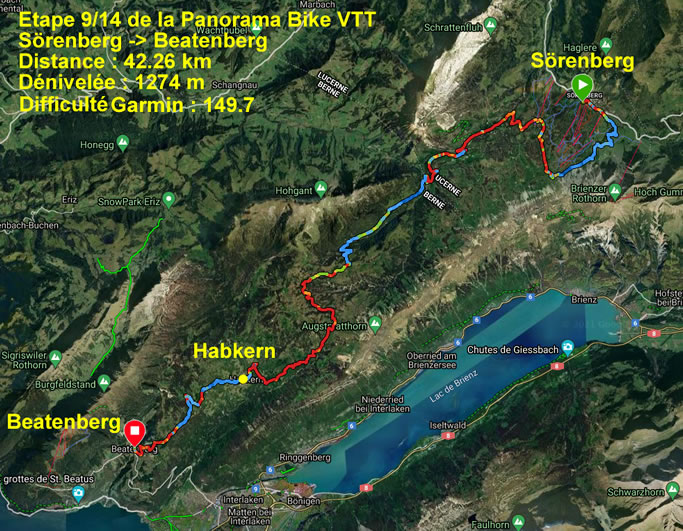 Après avoir taillé une bavette principalement sur le domaine de la bicyclette et ce qui va autours nous avons pris congé les uns des autres au début d'une belle descente sur Habkern qui est le lieu finale officiel de l'étape mais pour ma part je pousserai jusqu'au Beatenberg non sans avoir pas mal transpiré me tapant encore quelques centaines de mètres de dénivelée avant de me poser dans la descente, sur un banc admirant la vue et taillant une bavette avec un vététiste allemand qui était en nage venant de faire 800 m de dénivelée depuis Interlaken. Ce point de vue est le plus beau du tour à mon avis.