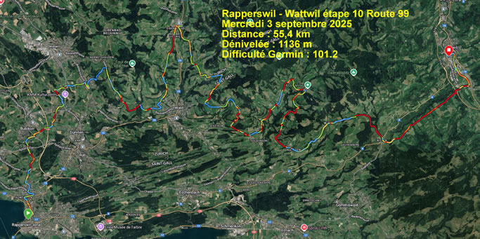 L'arrivée à Wattwil se fait d'une jolie manière avec environ 10 km de descente à avaler qui s'était quand même gagnée par des montées correctes mais qui dans l'ensemble de l'étape mettait dans la balance un dénivelé positif supérieur aux descentes, Rapperwil le début de l'étape étant plus bas que Wattwil, mon point de destination finale du jour.