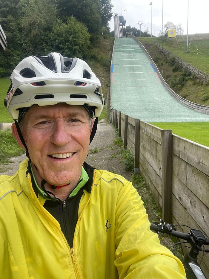 Ce sont ensuite des flancs de côteaux suivant les contours de la montagne, qui permettent de ne pas trop monter ou descendre mais quand même de progresser dans l'itinéraire. Cette étape plus que les autres me semble-t-il met à profit les contours du terrain pour éviter les montées abruptes. Ayant tournée autours de la tour du Bachtel qui est un émetteur fixé au-dessus d'une tour d'observation, je pointe mon nez à Gibswil que je reconnais directement de par ses tremplins de saut à ski (cf photo ci-contre). Je vais me réfugier sous l'avant toit de la cabane du club de saut à ski de Gibswil pour me mettre à l'abri d'une pluie fine qui tombe au moment que je choisis pour prendre un pique-nique sorti du sac, œuf, fruits secs et barre énergétique.
