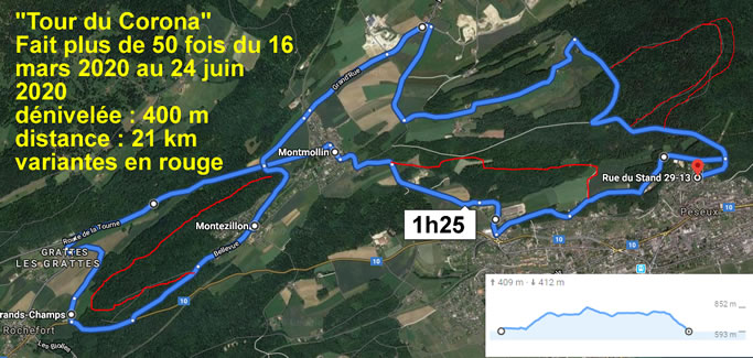 Depuis le début du confinement le 16 mars 2020 jusqu'au vacances d'été le 3 juillet, j'aurai fait 2005 km et 58 fois le même tour, celui du "Corona" sur 103 sorties (18,92 km en moyenne par sortie) alors qu'il y avait 110 jours à disposition .