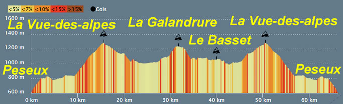 Après 1,5 km environ je retrouve la route de la Vue-des-Alpes dont l'asphalte vient d'être refaite et qui est vraiment parfaite avec une piste cyclable ou un trottoir rendant la montée plus sécurisée. Le temps est beau mais frai et arrivé au sommet je passe un couche coupe-vent supplémentaire avant de me laisser descendre sur la Chaux-de-Fonds san encombre.