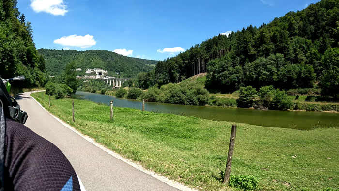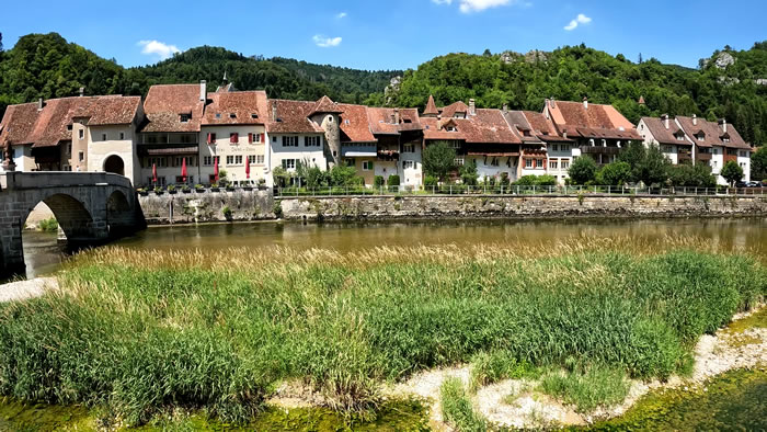 Quelques minutes de poussée, des chemins en forêt, dans les champs, des beaux points de vue sur l'Ajoie puis la vallée de Saint-Ursanne annoncera mon arrivée dans le village médiéval de Saint-Ursanne après avoir longé le Doubs sur quelques encâblures.