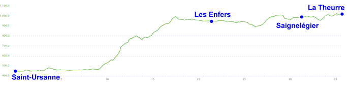 Le Doubs caractérise la première moitié de ce trajet, qui le longe à la découverte d'une région merveilleusement isolée. Une longue montée jusqu'au plateau des Franches-Montagnes ramène à la civilisation. Murgers, fermes isolées et chevaux paissant accompagnent jusqu'à Saignelégier.