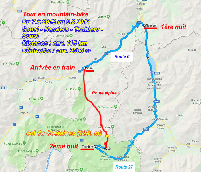3ème jour Tschierv - Scuol (étape N°1/16 « l'Alpine Bike 1 ») Cette étape N°1 de "l'Alpine Bike Route N°1" est prévue dans le sens Scuol - Tschierv mais comme notre itinéraire des 3 jours impliquait le sens inverse, c'est un début à l'envers qui nous a fait découvrir cette étape magnifique. Elle a été plus agréable dans le sens où nous l'avons faite car la dénivelée réalisée la veille nous a favorisés ce jour.