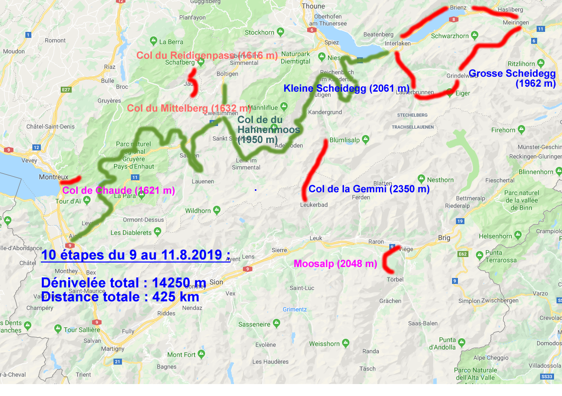 Du jeudi 8.8.2019 au dimanche 11.8.2019, réalisation de 4 étapes de l'Alpine Bike Route 1 Déplacement à Interlaken en train le jeudi et ensuite :